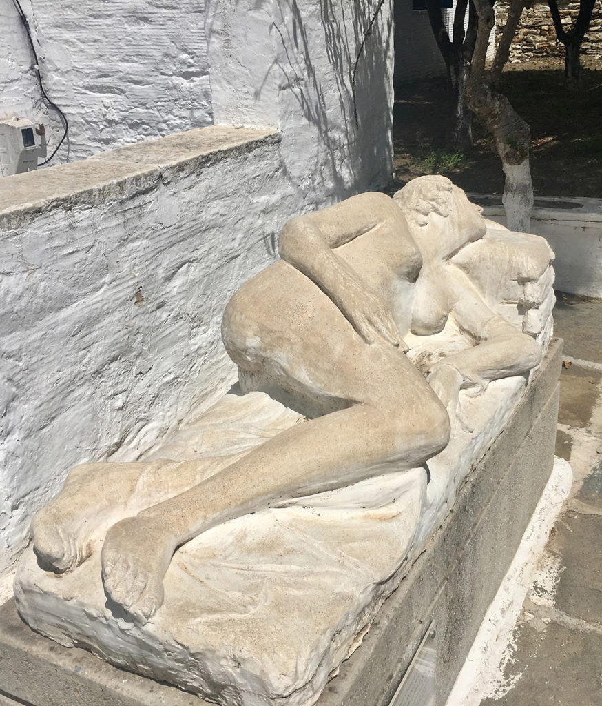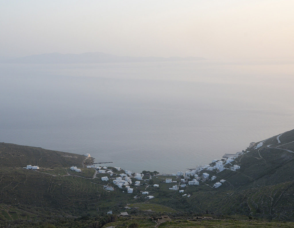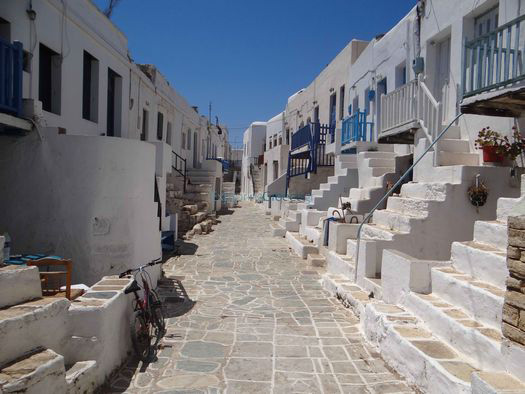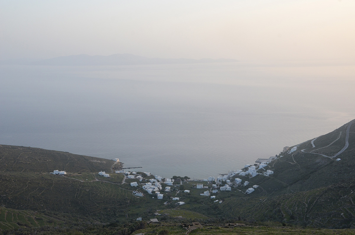 Η Χώρα της, σφηνωμένη στο χείλος της κατακόρυφου γκρεμού, είναι από τις ομορφότερες των Κυκλάδων. Τα πάντα ασπρίζονται για την αναμονή της μεγάλης γιορτής του Πάσχα. Ο ασβέστης, μέσα κι έξω από κάθε σπίτι, σε φράχτες, σε αρμούς των πλακόστρωτων δρόμων, τους τοίχους, τις αυλές, στα σκαλιά, τις πεζούλες, καλύπτει με τη λευκότητά του τα πάντα.