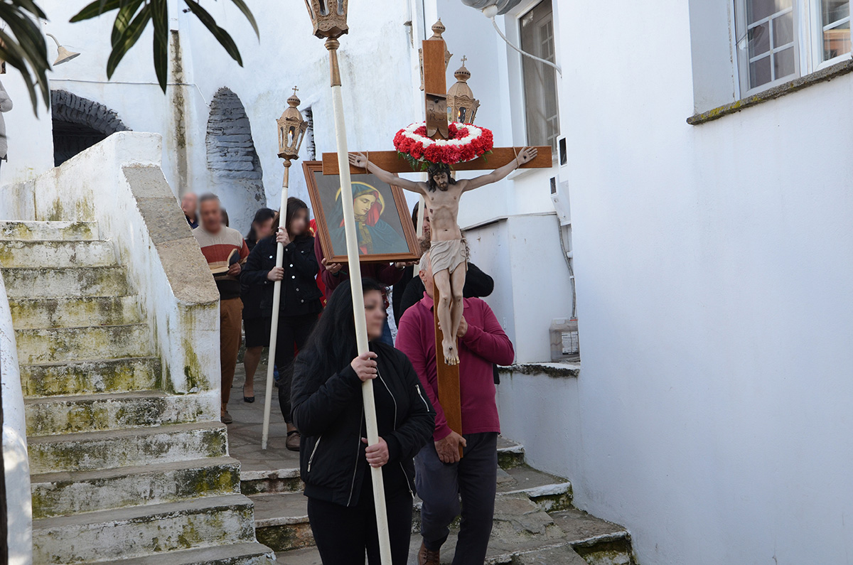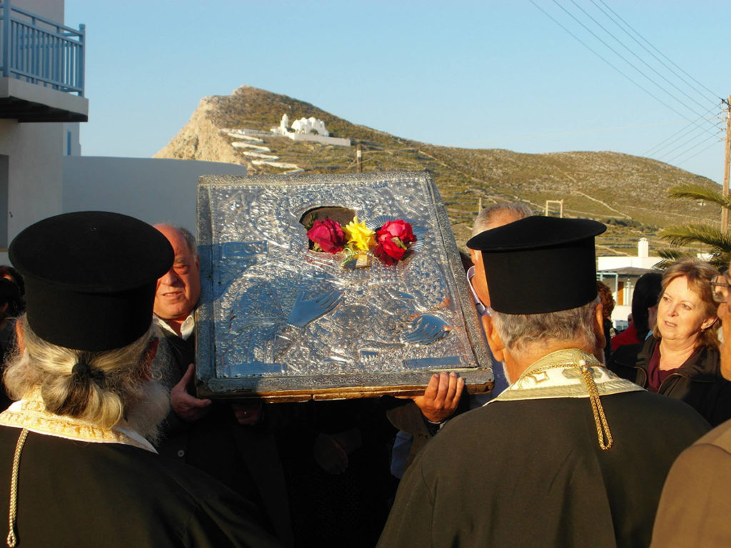 Την πορεία της Εικόνας της Παναγίας. Την Κυριακή του Πάσχα η ασημοστόλιστη Εικόνα, ξεκινάει την διαδρομή της από τον ναό της Παναγίας προς την Χώρα. Όλα τα σπίτια των ντόπιων ανοίγουν να υποδεχθούν την εικόνα, καθώς και τον κόσμο που την συνοδεύει. Ντόπιοι και επισκέπτες έχουν την ευκαιρία να κεραστούν και να γευτούν τοπικά πασχαλινά εδέσματα και ποτά, με πολύ κέφι και κοινωνικοποίηση σε όλα τα σπίτια.